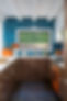Outlined in bright white grout, this kitchen's Hexite backsplash in Adriatic Sea offers up a cool contrast to playful pops of orange.